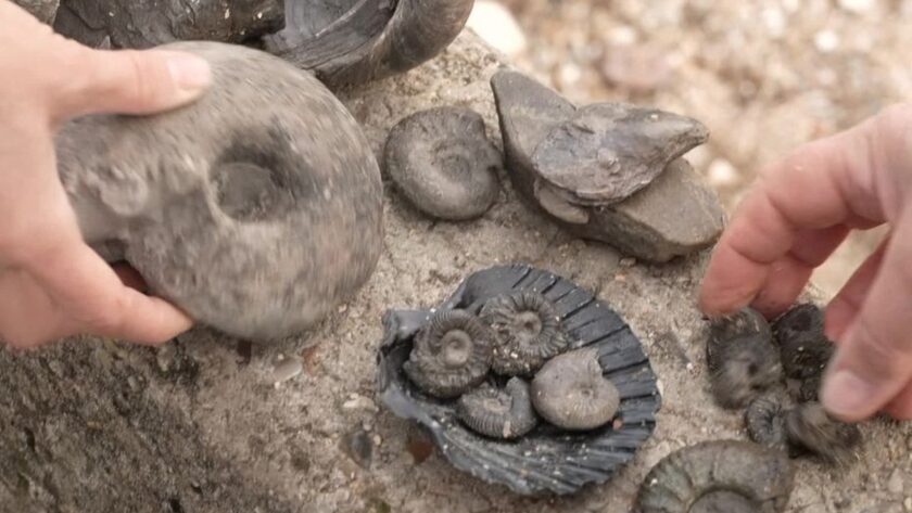 Když se odliv stáhne, milovníci fosilií obsazují pláže u úpatí útesů Vaches Noires. Paleontologové, ať už profesionálové, nebo amatéři, pečlivě prozkoumávají půdu v hledání kousků historie.